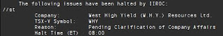 Trading in West High Yield (TSXV:WHY) was halted before the open on Friday. It appears that IIROC is seeking "clarification of company affairs."